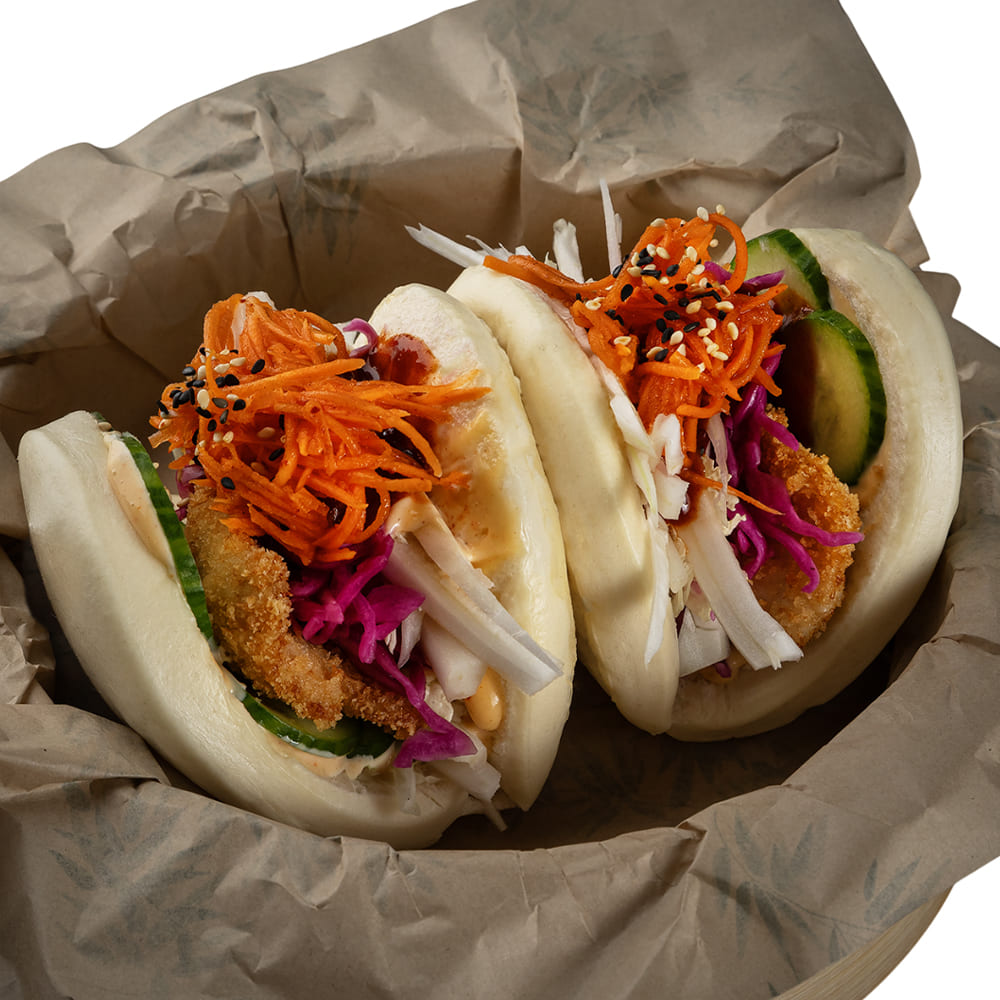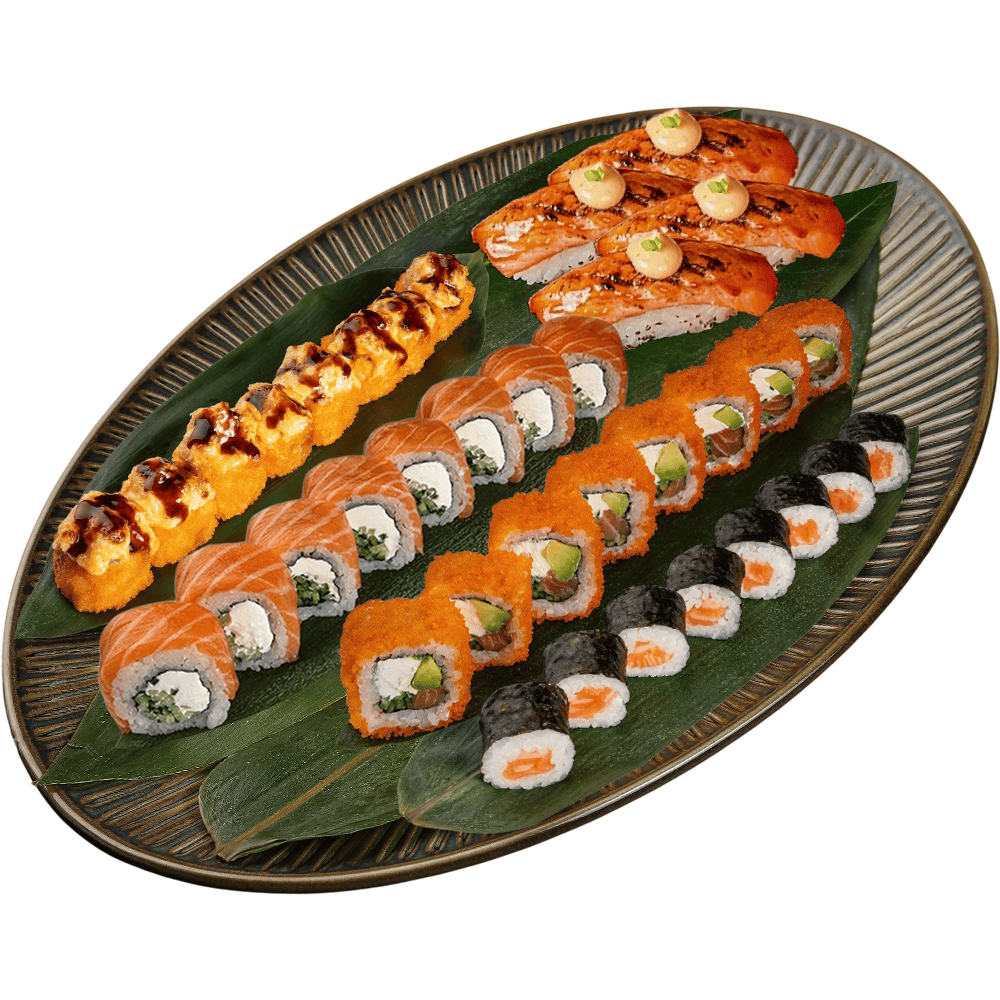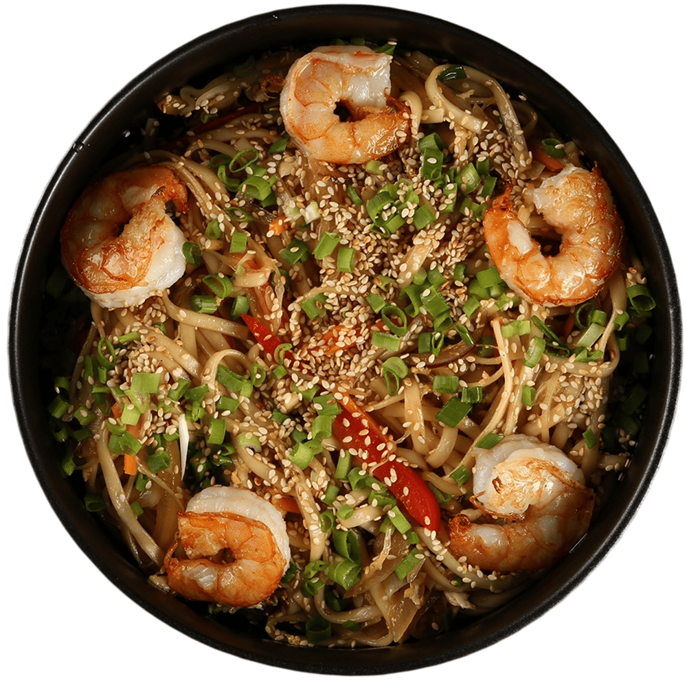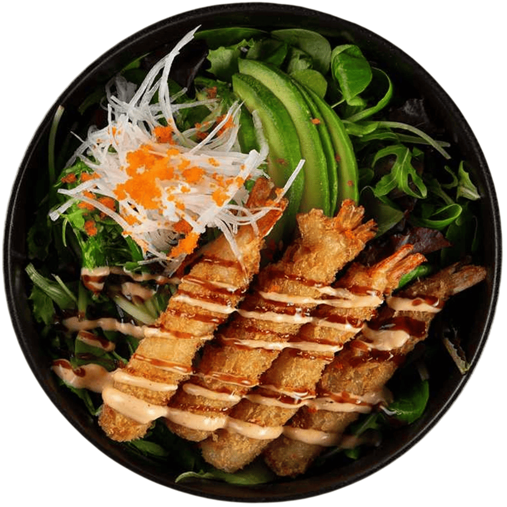 Suši rīsi, tīģergarneles, kimči burkāni, gurķis, avokado, čili, daikons, nori čipsi, sweet chilli fusion mērce, ponzu mērce, melnās sezama sēklas